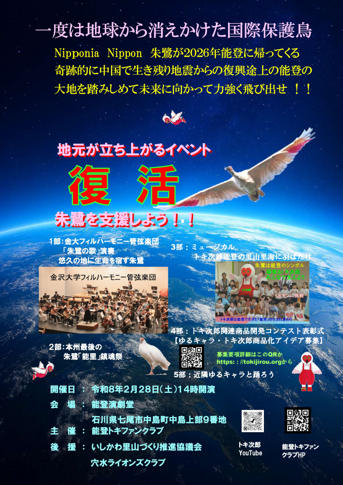 トキ次郎と ・2024/6/17 NHK石川で放送されました「復興のシンボルにトキの「ゆるキャラ」完成穴水町/NHK石川」で検索 ください ・2024/6/12 ニッポニア・トキ次郎見参!!2024/1/1の地震で能登ファンクラブの事務所全壊、多くの会員も被災し 能登トキファンクラブのホームページも閉鎖していましたが、本日から能登放鳥と地震復興を目指し活動を再開する ことにしました、その一弾として予てから計画していた、ゆるキャラのトキ次郎が初お目見えしました,WEBでトキ次郎 と入力するとNHKや新聞報道が出てきます ~心寄せるシンボルを~ |