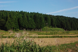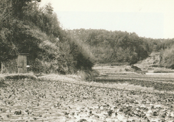 海岸に沿うようにある水田は整備されず荒れている、周辺山林は天然林である |