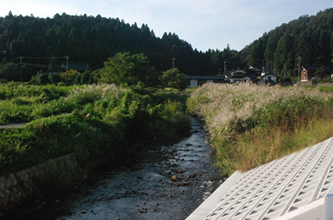 七海川は一部コンクリート護岸があるが概ね自然が残されている、水田は基盤整備済みで排水が良港である、周辺山林は植林が進んでいる |