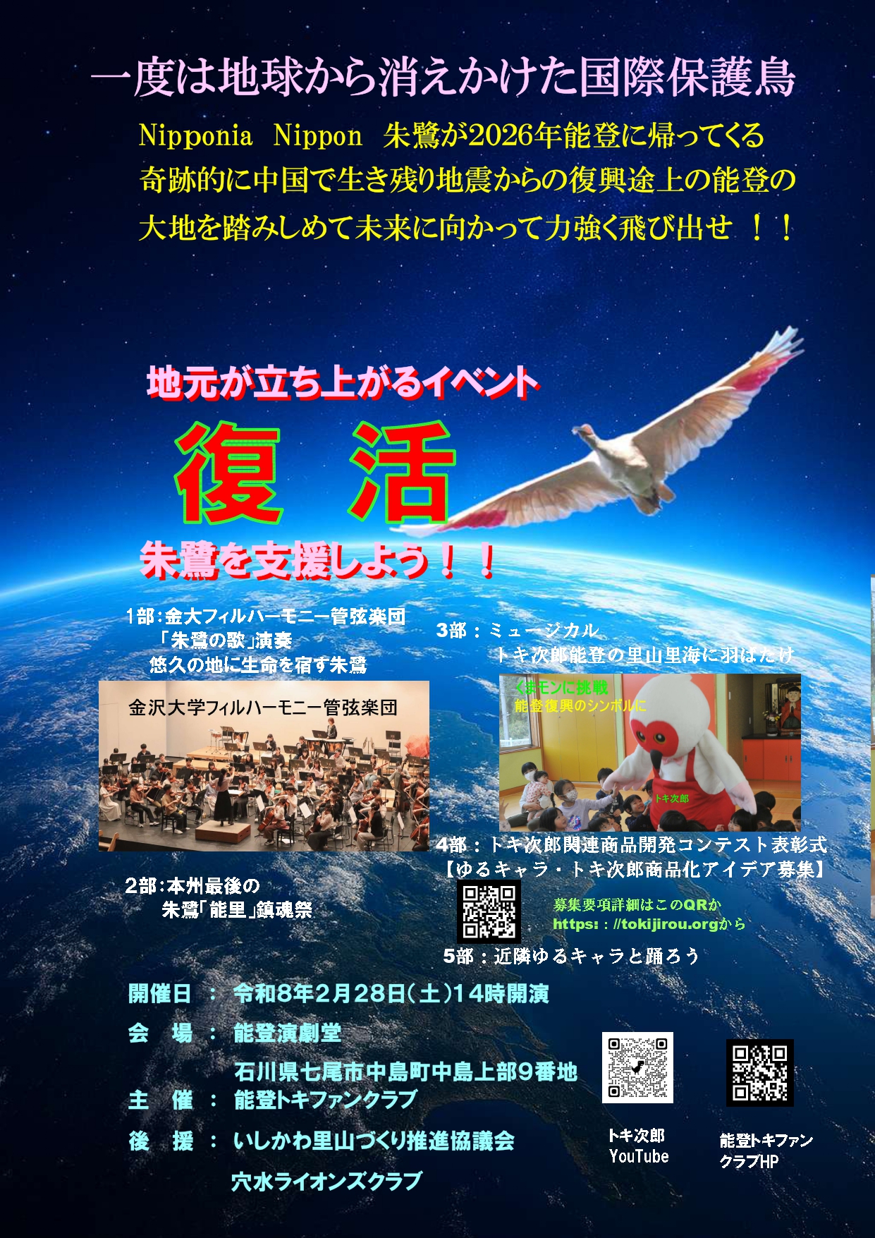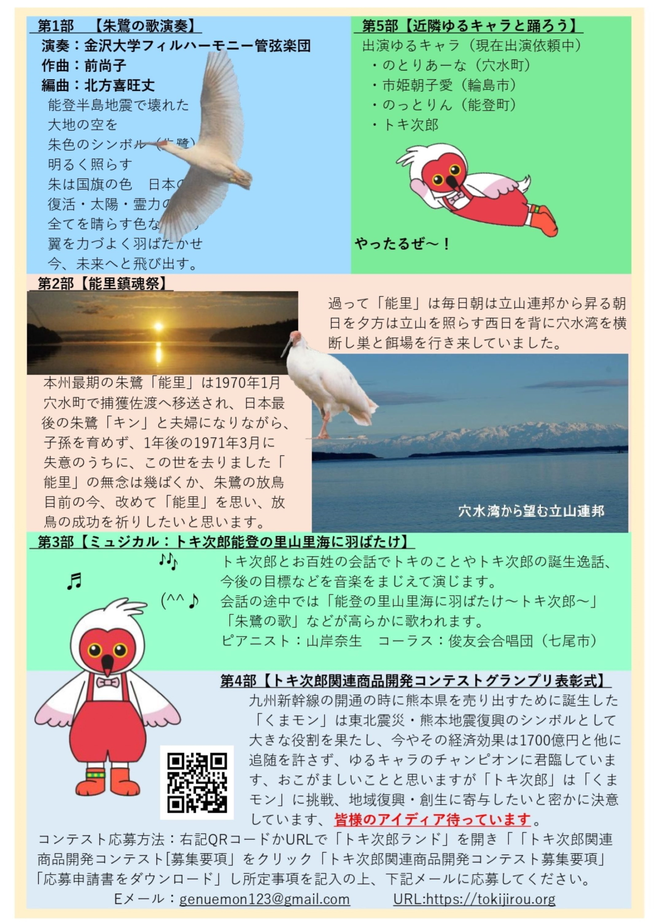 トキ次郎と ・2024/6/17 NHK石川で放送されました「復興のシンボルにトキの「ゆるキャラ」完成穴水町/NHK石川」で検索 ください ・2024/6/12 ニッポニア・トキ次郎見参!!2024/1/1の地震で能登ファンクラブの事務所全壊、多くの会員も被災し 能登トキファンクラブのホームページも閉鎖していましたが、本日から能登放鳥と地震復興を目指し活動を再開する ことにしました、その一弾として予てから計画していた、ゆるキャラのトキ次郎が初お目見えしました,WEBでトキ次郎 と入力するとNHKや新聞報道が出てきます ~心寄せるシンボルを~ |